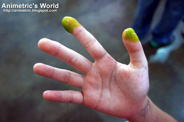 The green gooey slime sticks and stains your skin, lol. We were assured however that it would wash off with soap and water.